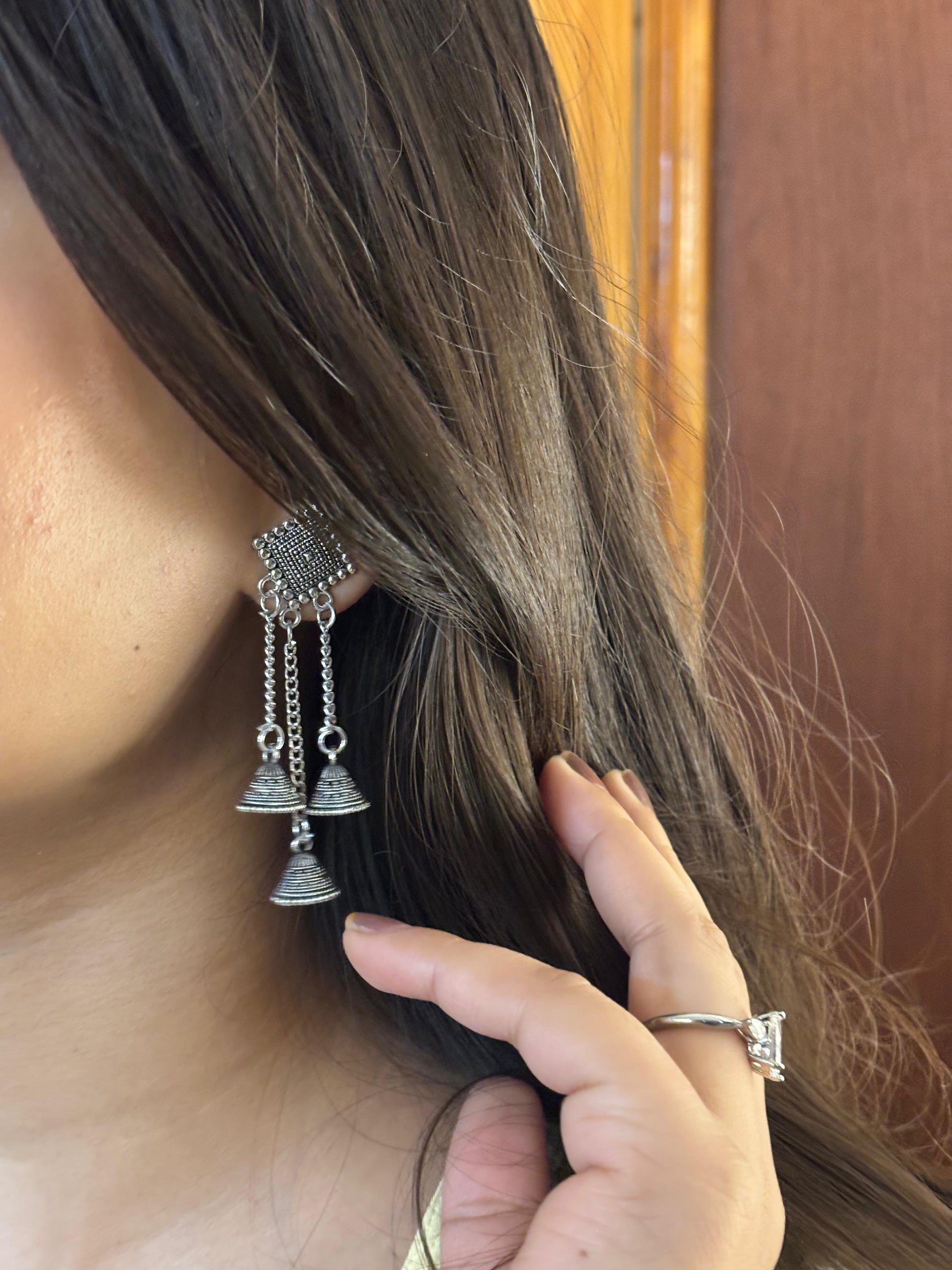 - Silver square & chain jhumka earrings – Square oxidised stud paired with chain-linked mini jhumkas for a layered look.