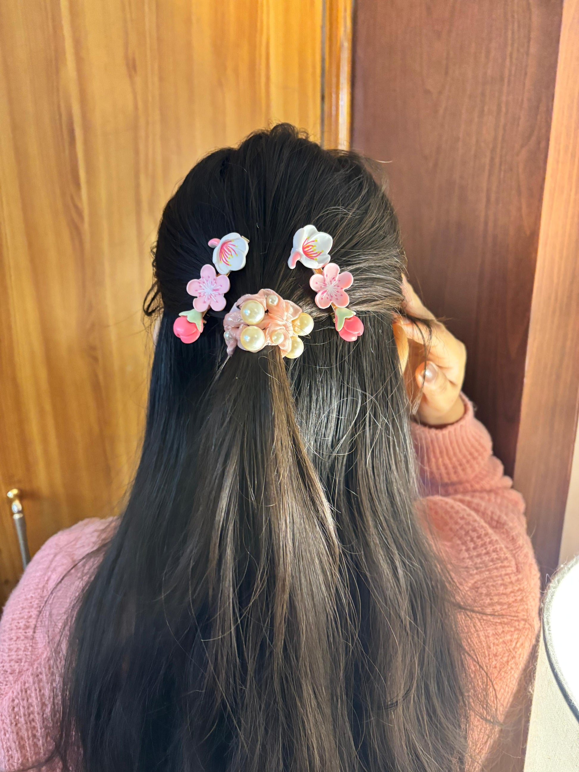 - Pink flower hair clips (pair) – Translucent pink floral hair accessories with a soft glossy finish.