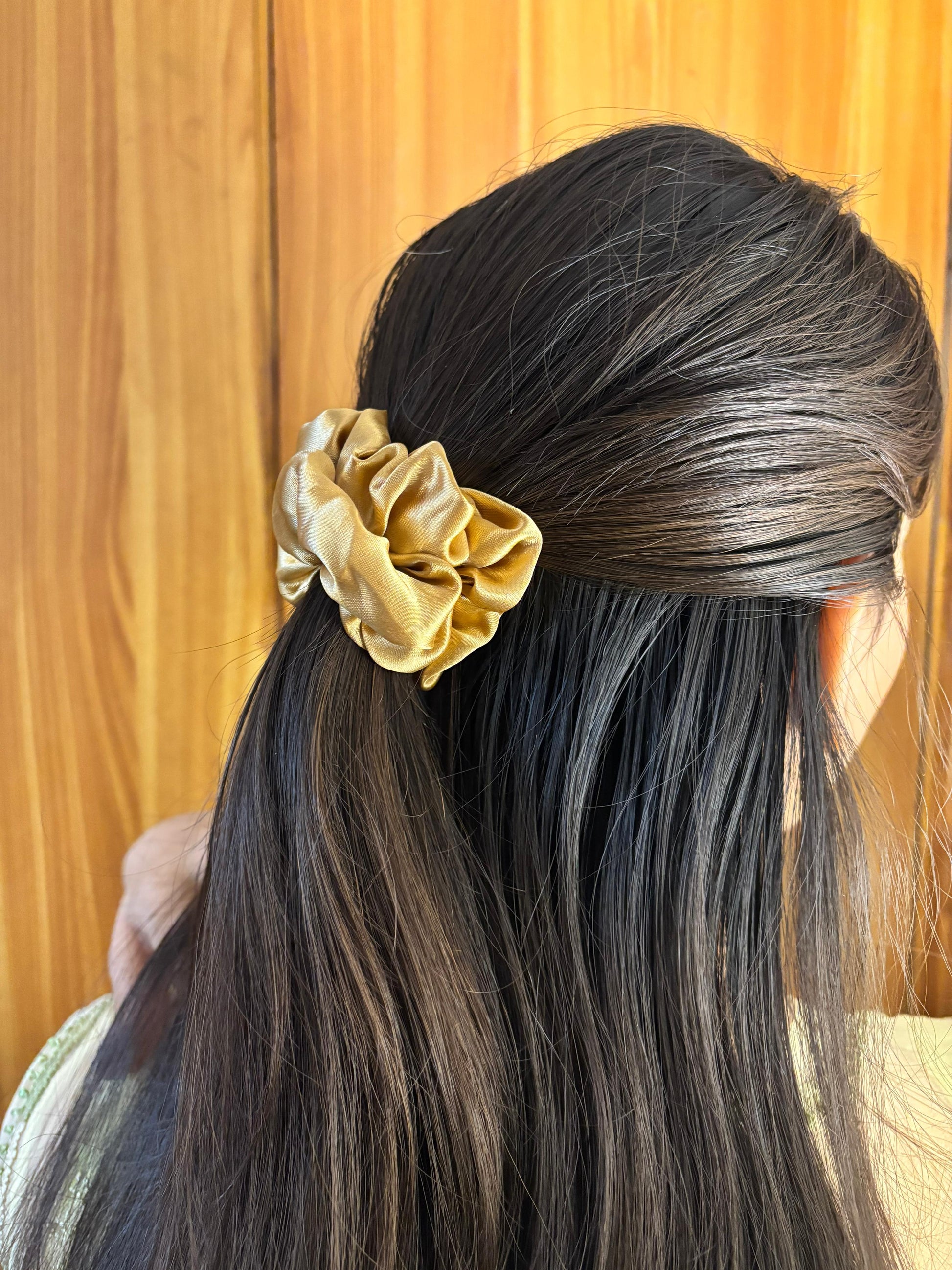 - Gold satin scrunchie – Luxe satin scrunchie in an elegant gold tone.