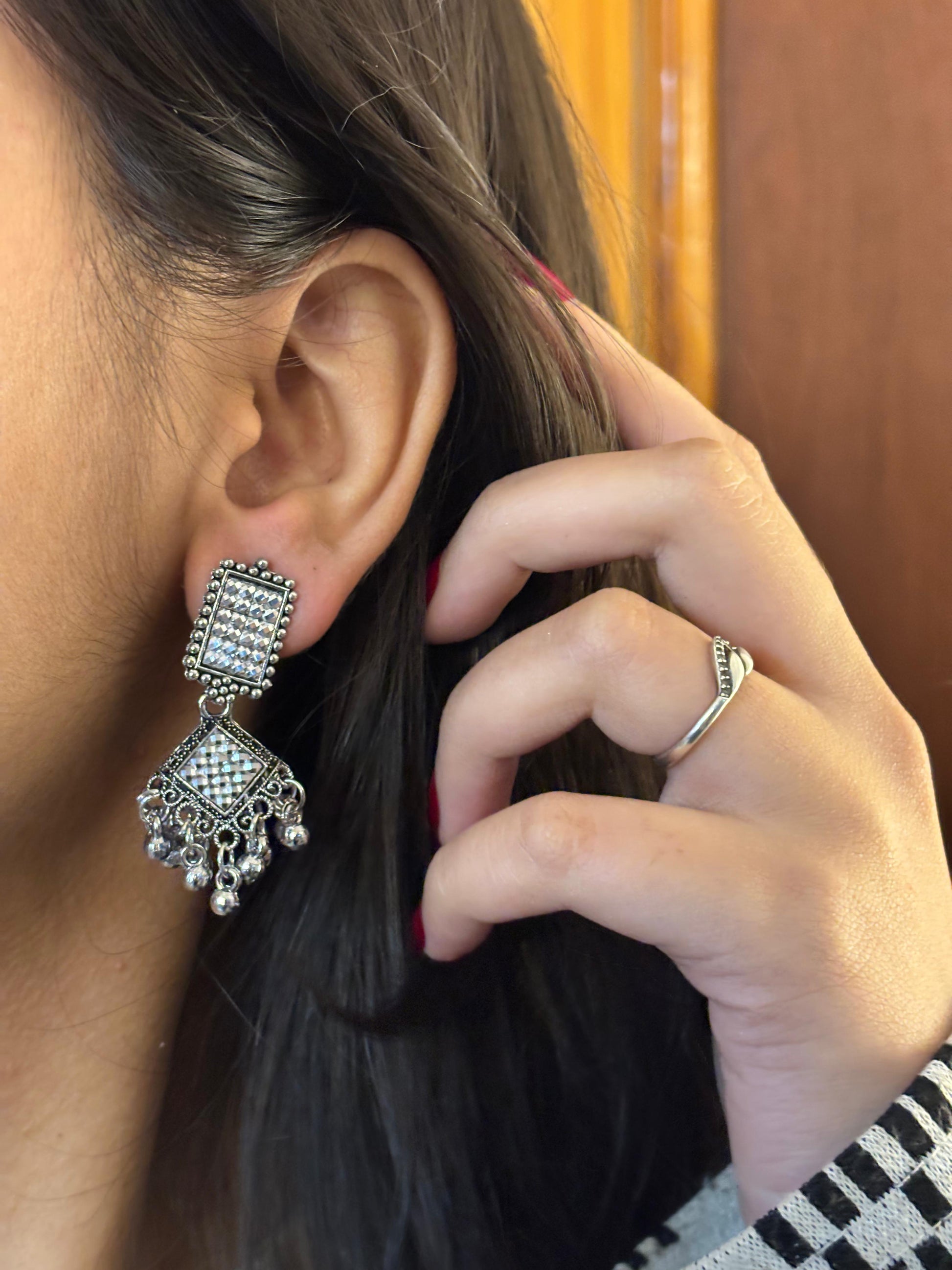 - Silver square jhumka earrings – Square crystal stud paired with an engraved square plate and hanging bead detailing.