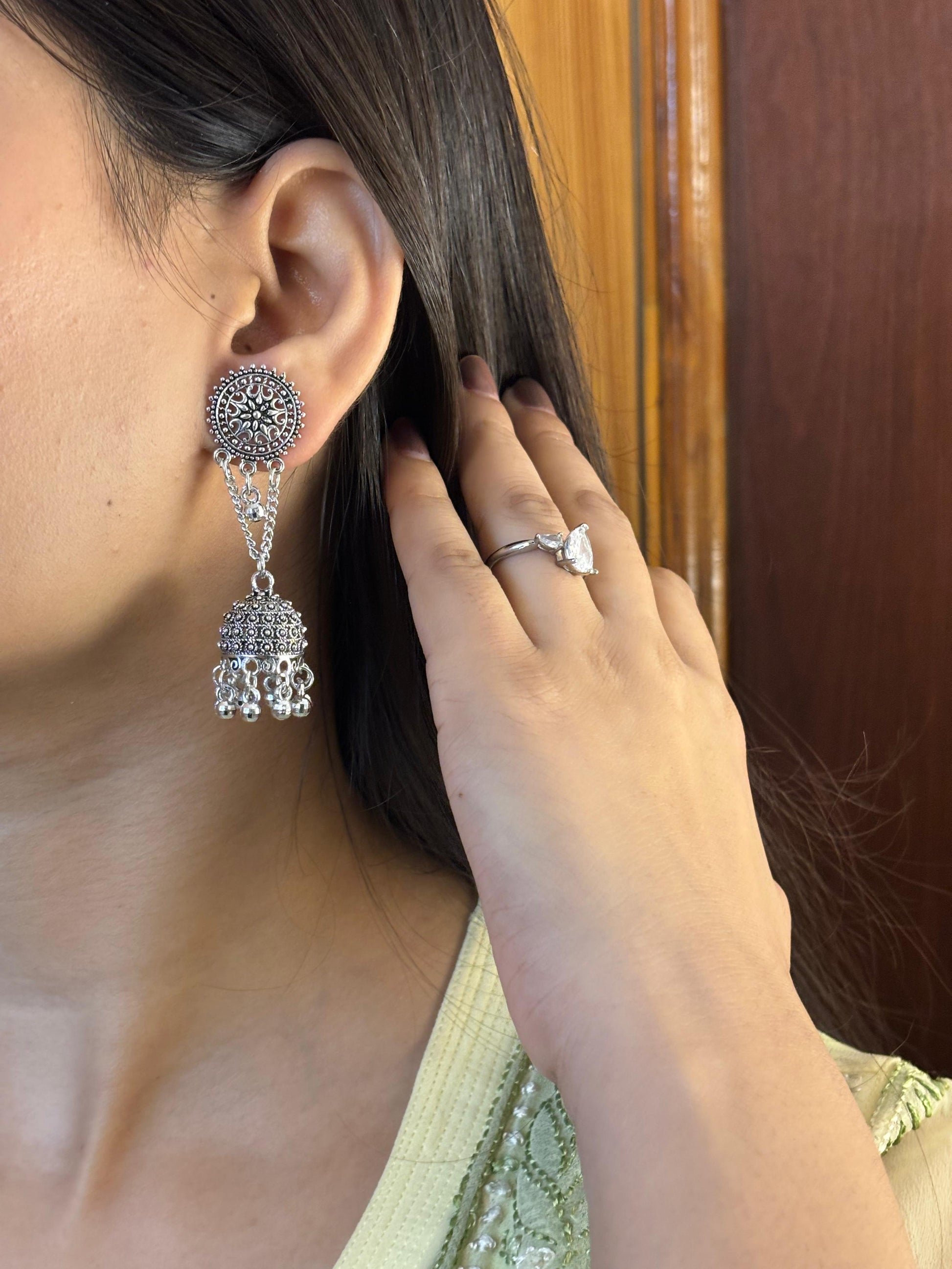 - Silver square & chain jhumka earrings – Square stone stud connected with chain-linked mini jhumkas for a layered look.