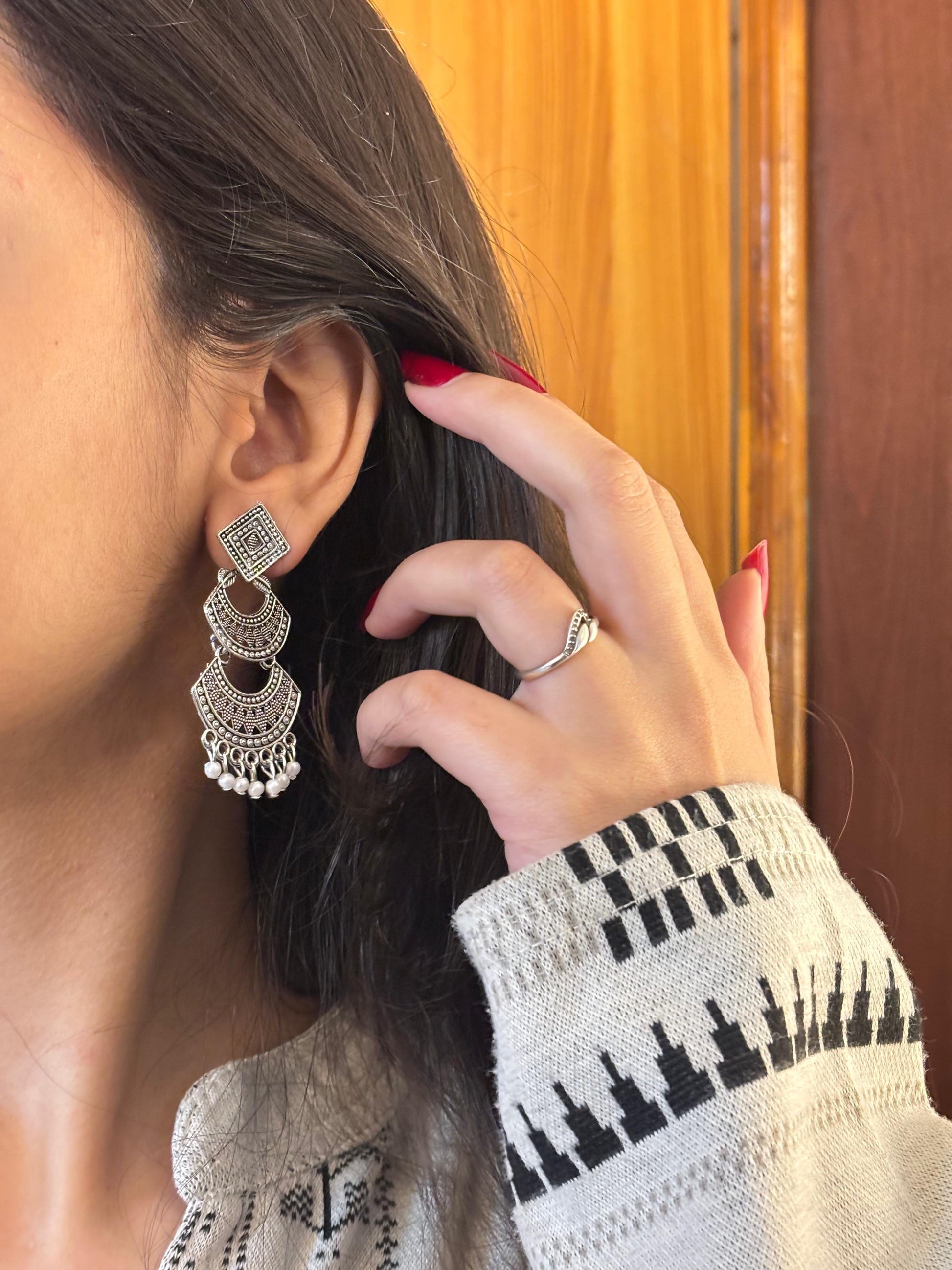 - Oxidised crescent jhumka earrings – Semi-circular oxidised design with hanging bead accents.