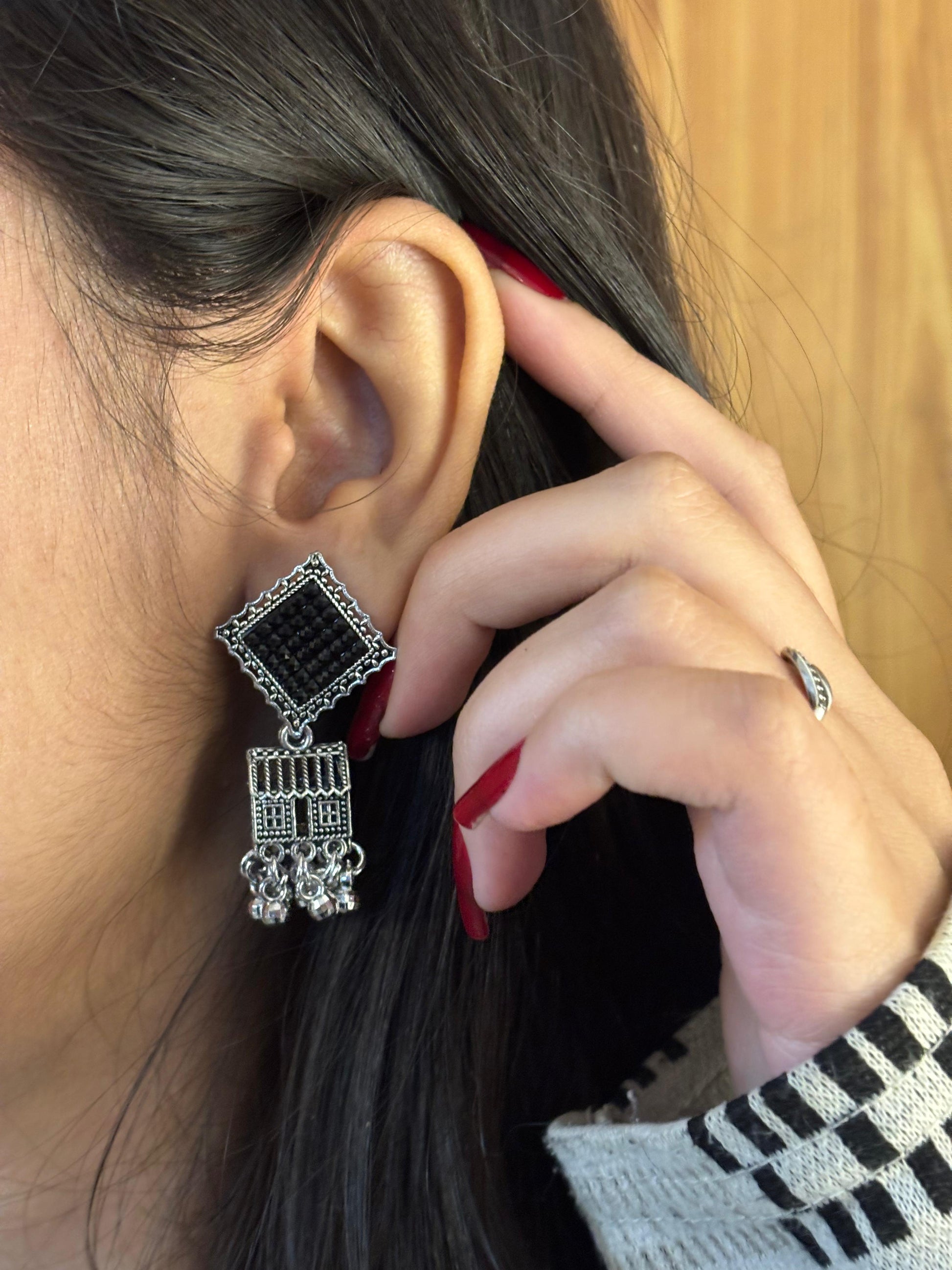 - Black square jhumka earrings – Square stud top embellished with black stones and dangling ghungroo-style beads.