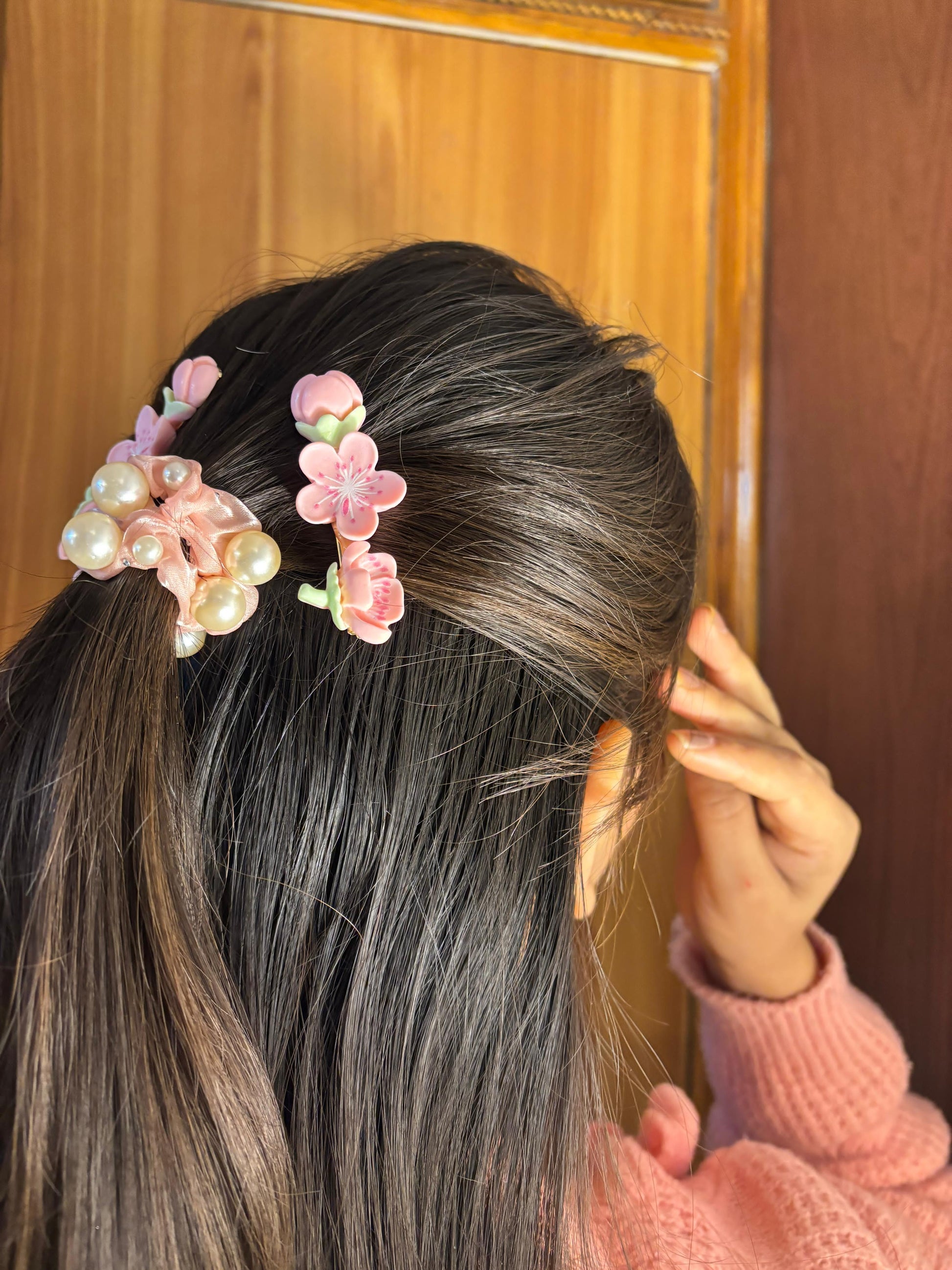 - Pink pearl scrunchie – Satin scrunchie with pearl embellishments.