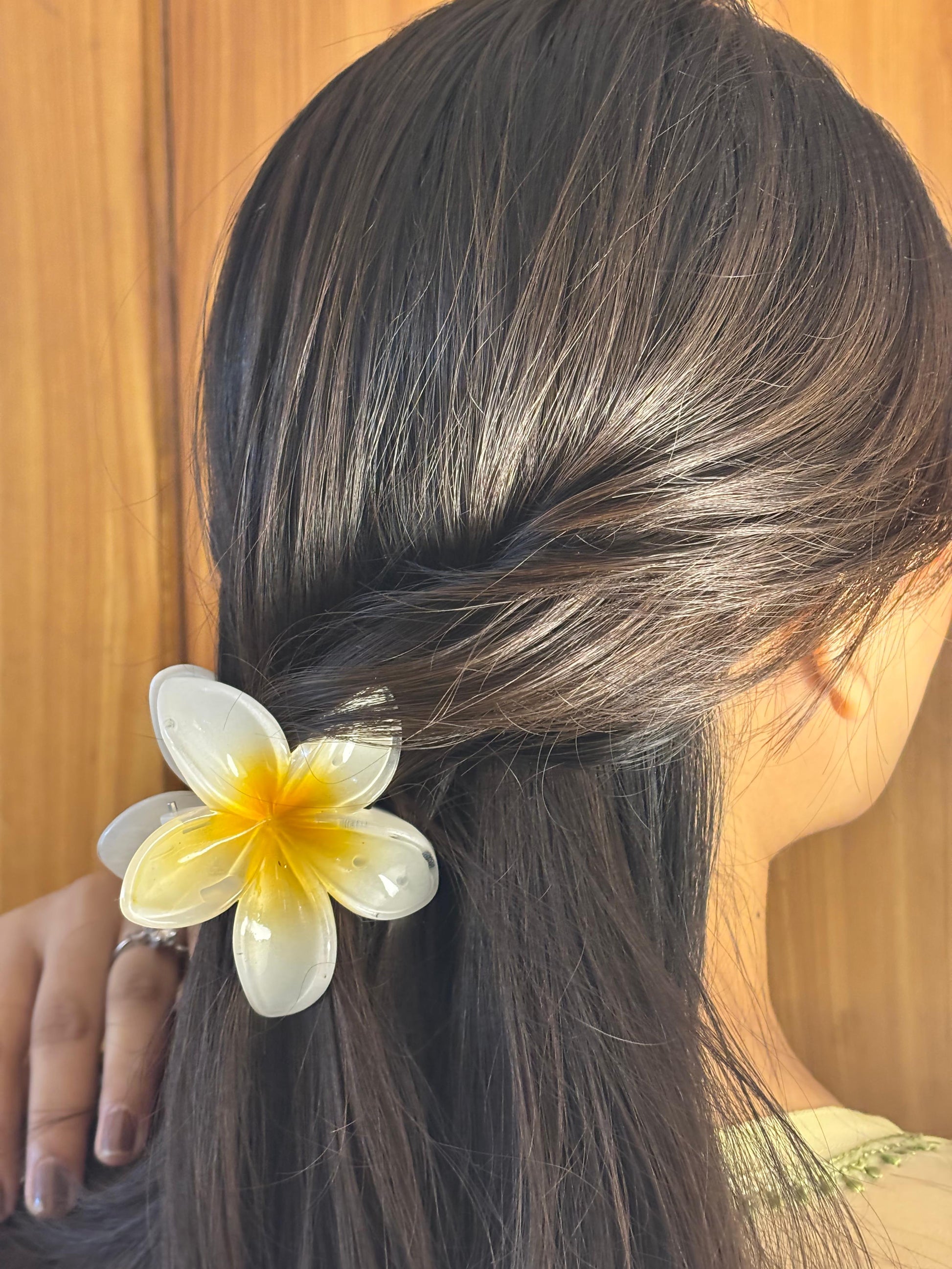 - White-yellow translucent flower hair clip – Dual-tone floral hair accessory.