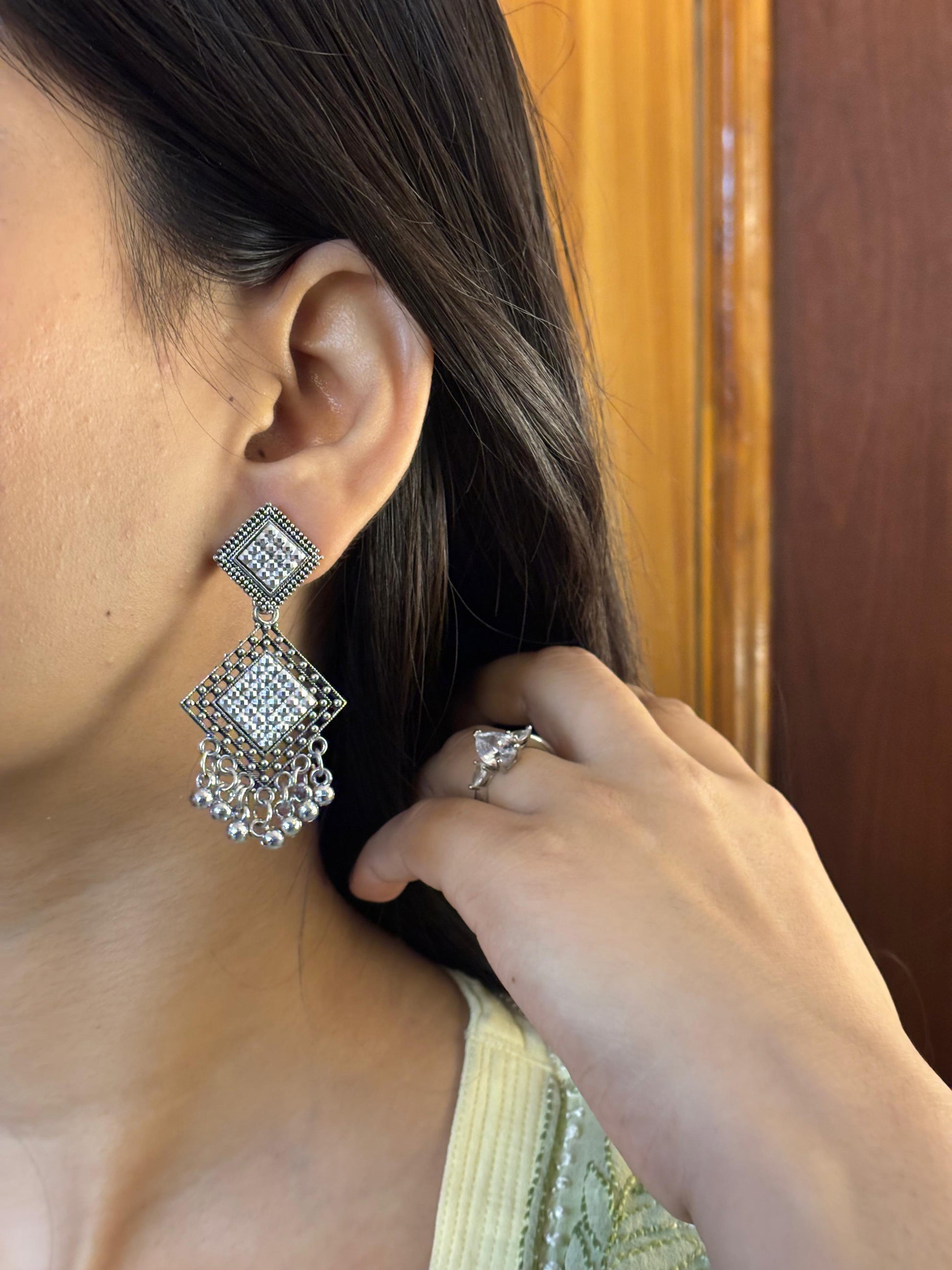 - Oxidised square jhumka earrings – Square engraved stud with layered dangling beads.