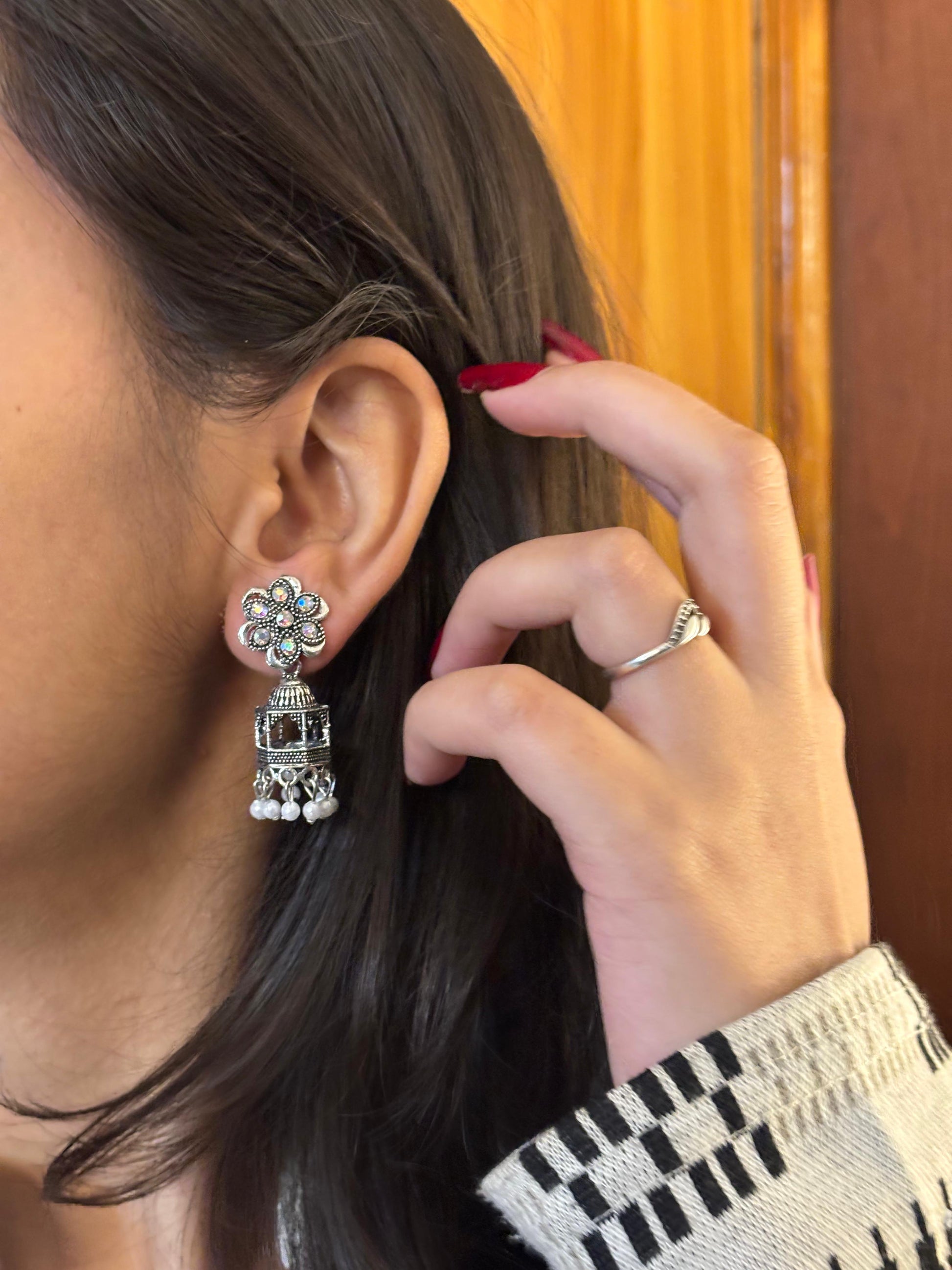 - Oxidised floral jhumka earrings – Flower-shaped stone stud with dome jhumka detailing.