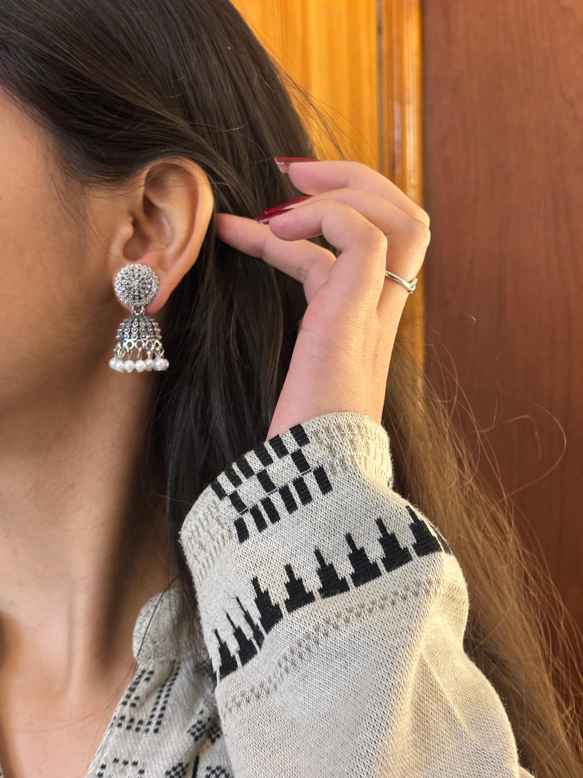 - Oxidised crescent jhumka earrings – Semi-circular design with hanging bead accents.