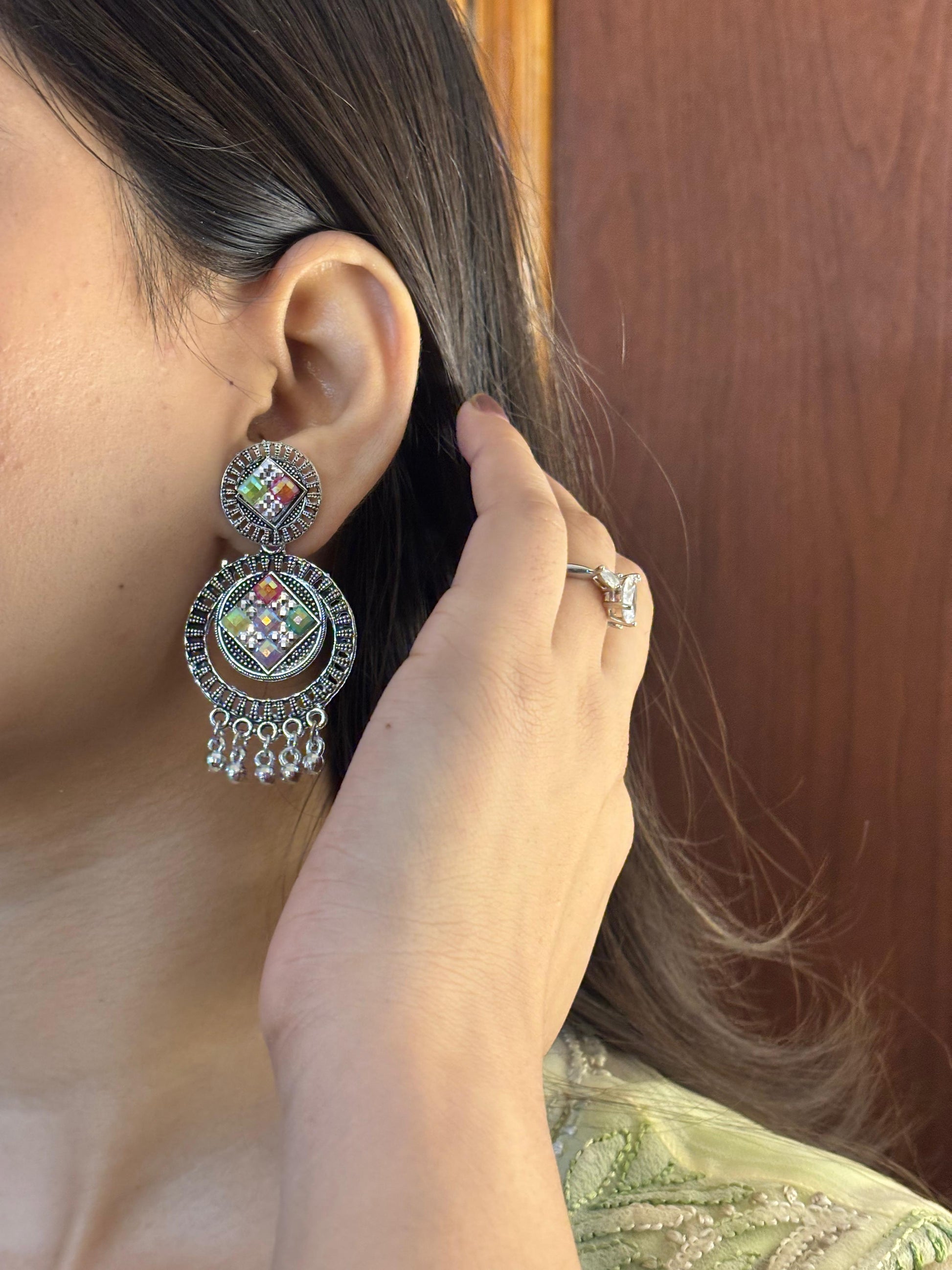 - Multicolour oxidised jhumka earrings – Circular stud with colourful stones and jhumka drops.